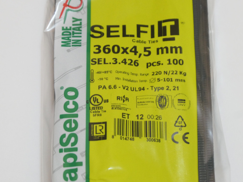 SapiSelco SELFIT Kabelbinder 360x4,5 mm – schwarze Farbe, 1 Packung = 100 Stück, Industriequalität (SEL.3.426)